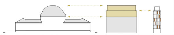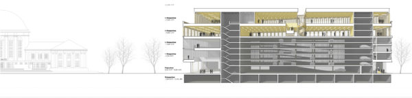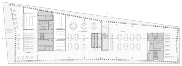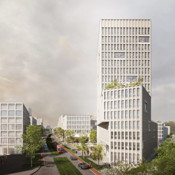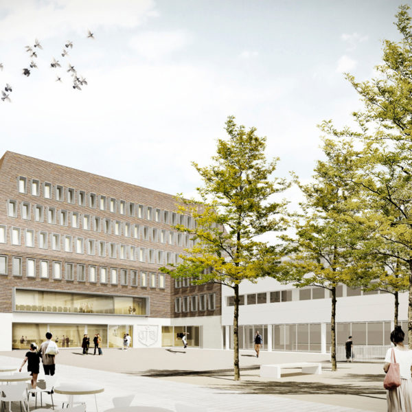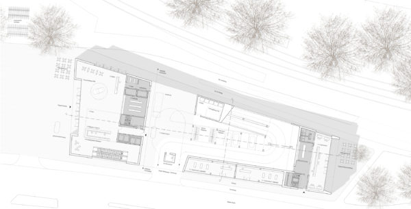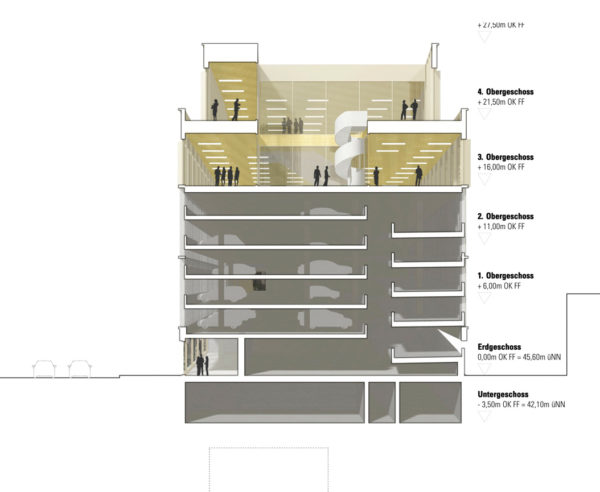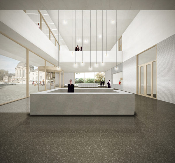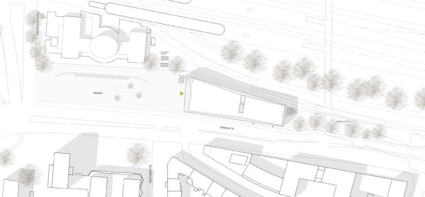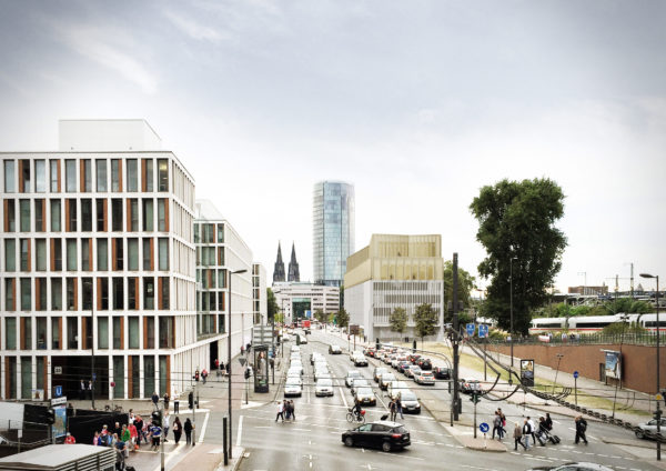 Urban building block and cultural building – the proposed building has been developed with a focus on these effects. In terms of urban planning, the volume requires structure in order to mediate between the height development of the neighbouring block structure to the south (Constantinhöfe and adjacent Gründerzeit building blocks) and the monument ensemble of Deutzer Bahnhof and Ottoplatz. Two recognisable height sequences have been created for this purpose: A change of material at the level of the eaves edge of Deutzer Bahnhof and the formation of a staggered storey with reference of the resulting parapet edge to the roof edge of Constantinhöfe.In its architectural form, the building is designed to have an integrating and mediating effect. The railway station remains the first building on the square. As the only other building addressed directly on Ottoplatz, the building is in dialogue with the colour and structure of the site, and the material division of the elevations of the new building into a stone base and a metal roof structure refers to the division of the surrounding historical buildings, which show a related proportional division of façade and steep roof structures. The tripartite division of the façades of the new building into a ‘public ground floor’, vertically structured upper storeys that are grouped together by means of pilaster strips and a monolithic roof extension in a continuous material also echoes the character of the Deutz railway station.