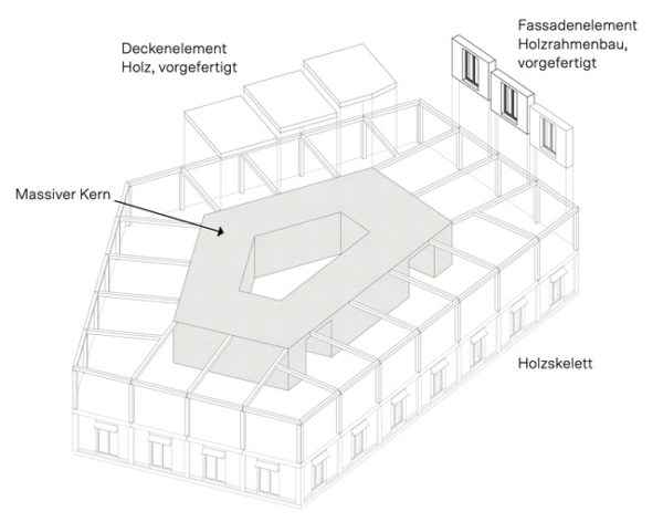The construction method combines a stabilizing concrete core with flexible living areas in a skeleton timber construction, ensuring economic efficiency and adaptability. Prefabricated wooden elements with a cladding of durable architectural terracotta allow for quick assembly and minimize maintenance efforts. The building access promotes neighborhood interaction through communal areas, while decentralized bicycle parking spaces and car-free inner courtyards create sustainable mobility solutions.