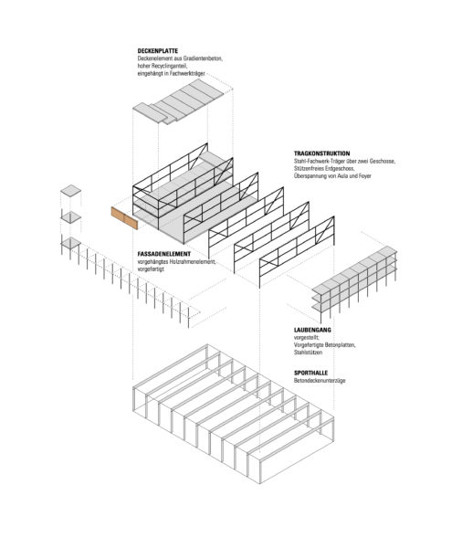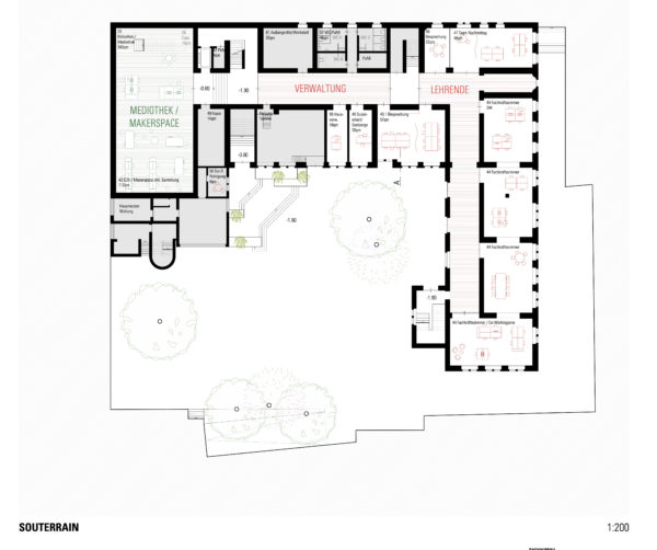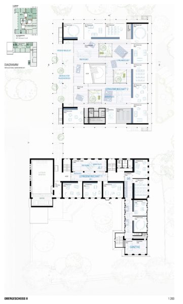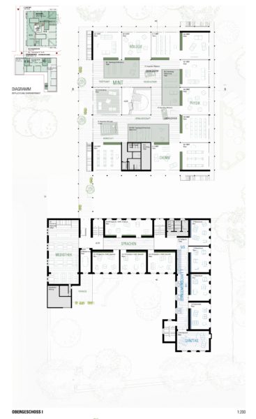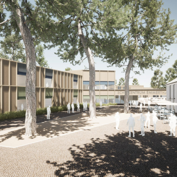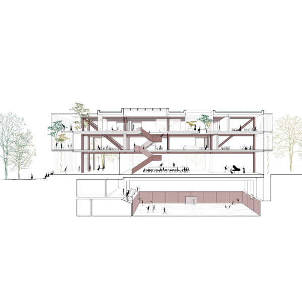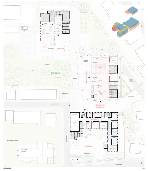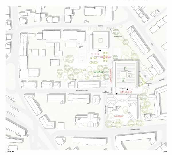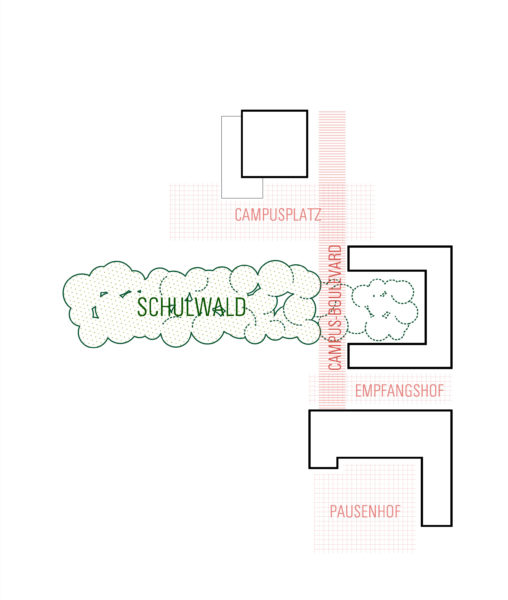 La ubicación compacta y sencilla de la nueva estructura crea un campus que sitúa la experiencia natural del bosque escolar en el centro y es respetuoso con los edificios catalogados y los espacios abiertos existentes. Un nuevo bulevar escolar une todas las funciones importantes y extiende el espacio de aprendizaje de todas las plantas a la zona exterior.