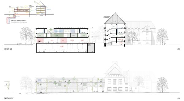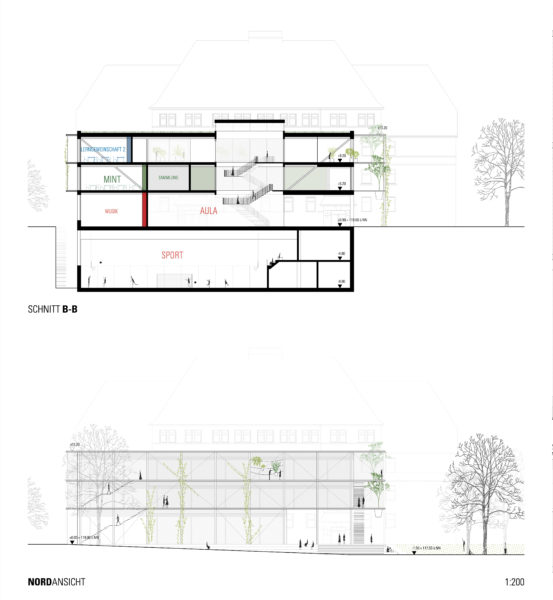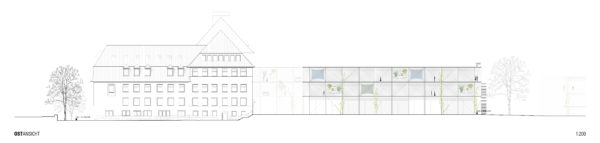En diálogo con la naturaleza, respetuoso con el edificio protegido, diseño compacto para un balance energético positivo y mucho espacio escolar al aire libre».