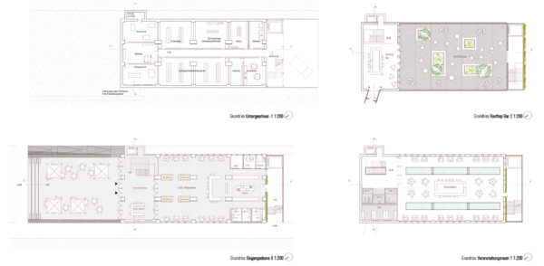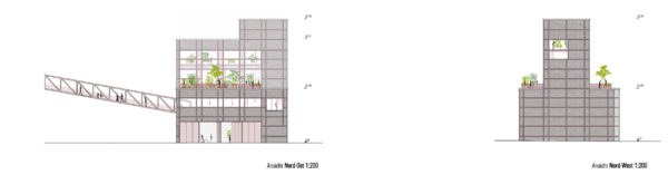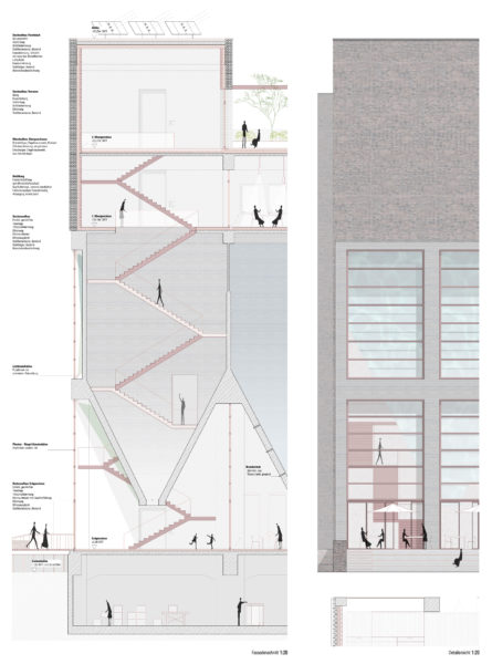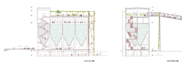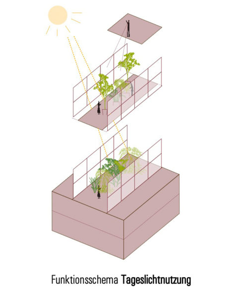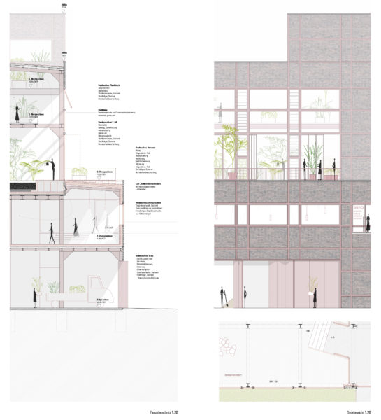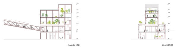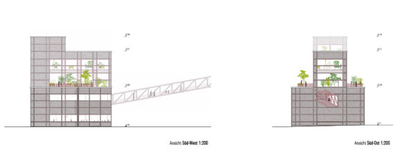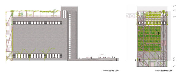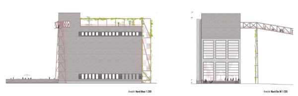 La antigua carbonera se ampliará estructuralmente mediante una estructura de andamiaje en el oeste y en el tejado. En el sur, se construirá una ampliación para el ascensor de pasajeros en una huella ligeramente superior a la caja de escalera existente. De este modo se mantiene la forma estructural del edificio existente. La estructura de andamiaje alberga las funciones de escalera (2ª vía de evacuación) y montacargas, y también proporciona el marco para la realización y presentación ejemplar de las diversas opciones de ecologización de la fachada, incluido el potencial de sombreado del tejado verde para la terraza de la azotea. La fachada sur se plantará con enredaderas silvestres, de modo que con los años se desarrollará una fachada verde que cambiará de color con las estaciones. Incluso desde lejos, el conjunto de la construcción verde transmite el mensaje del «invernadero» a los curiosos que se acercan.