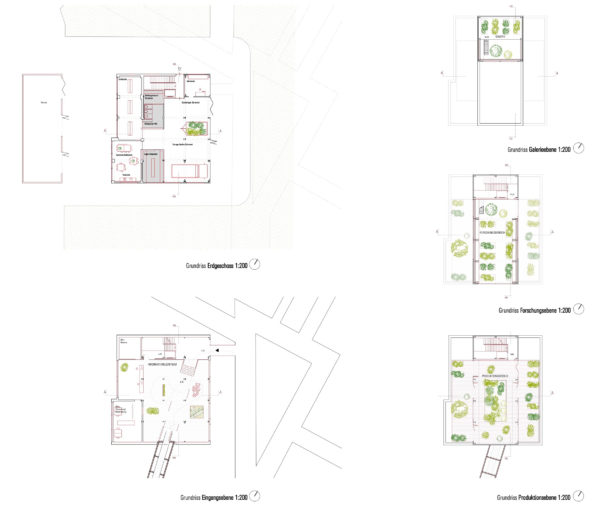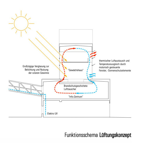 La idea del uso hortícola previsto del edificio se materializará arquitectónicamente, con un acceso sin barreras al edificio desde la altiplanicie existente. Aquí se instalará una planta central de información y exposición, desde la que los visitantes tendrán la opción de pasear por el puente de la energía. Sin embargo, todos podrán ver el puente a través de la gran abertura acristalada de la Greentower, lo que les permitirá experimentar visualmente el ciclo de la energía. Los pisos superiores se destinarán a la jardinería exploratoria de interior y exterior.