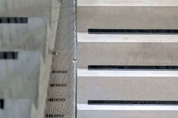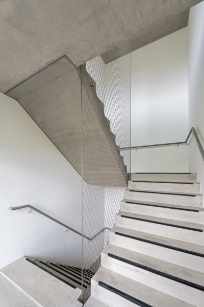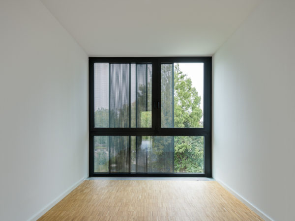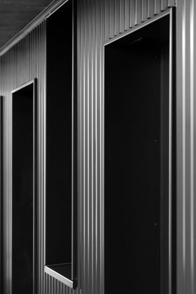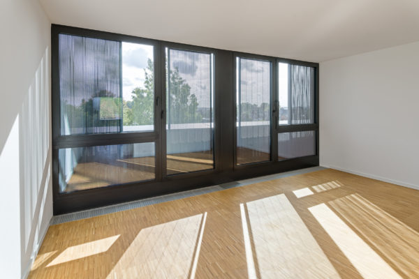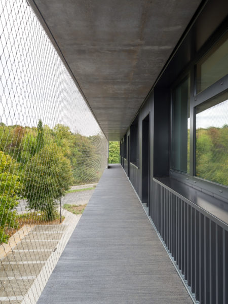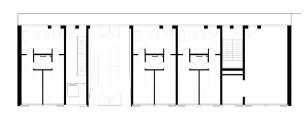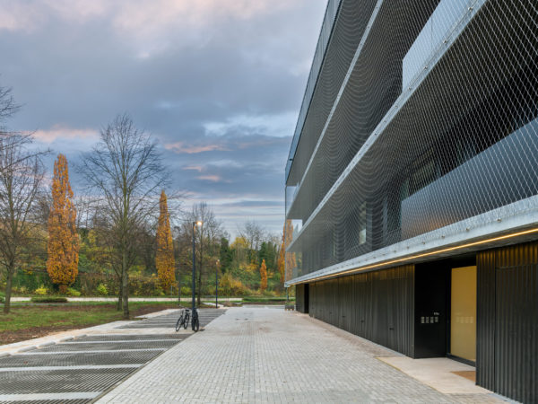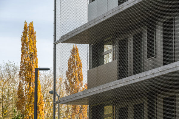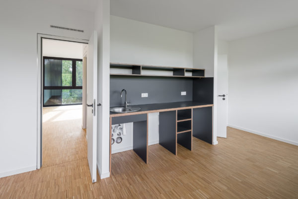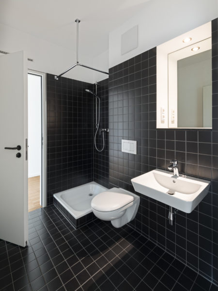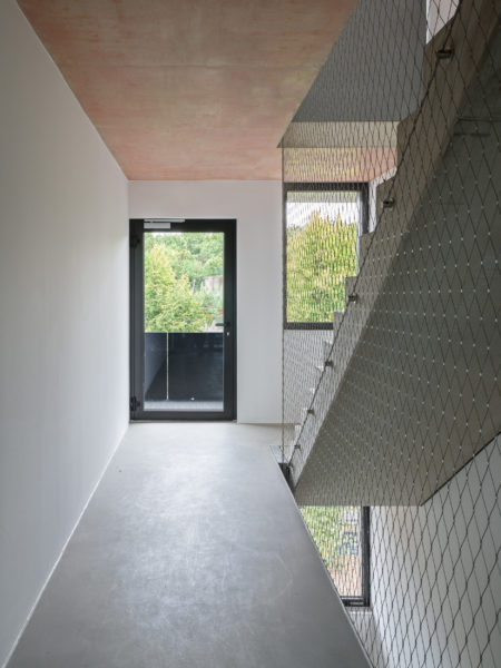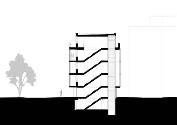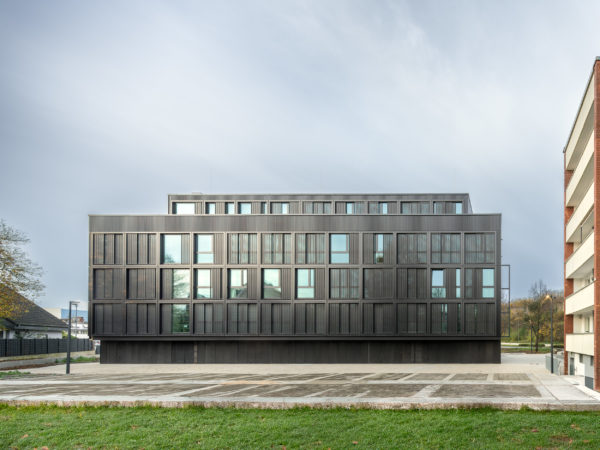 Situado en ángulo recto con el edificio existente en el solar, el jardín existente está protegido del ruido de la autopista, lo que mejora la calidad de la experiencia de los inquilinos existentes y de los nuevos. Todos los nuevos pisos están diseñados como pérgolas con sus salas de descanso orientadas al sur, hacia este jardín. En la 2ª planta, el nuevo edificio contará con un punto de encuentro comunitario, que ofrecerá lavadoras y podrá utilizarse también para actividades comunes de los residentes. Revestida íntegramente de madera, esta sala representa también el «corazón» de diseño de la casa, además del color negro básico de todas las demás superficies.