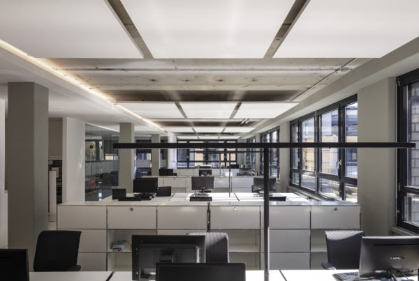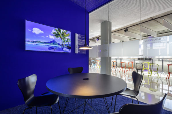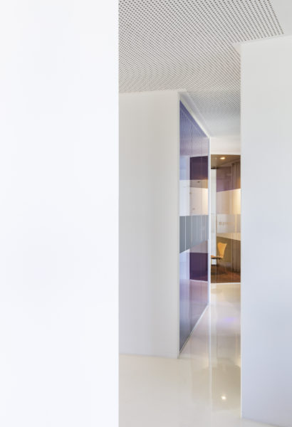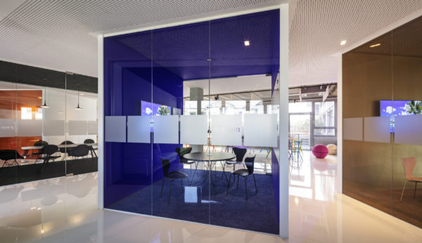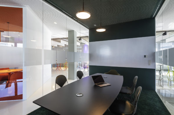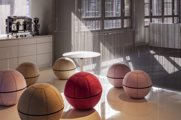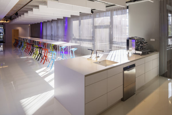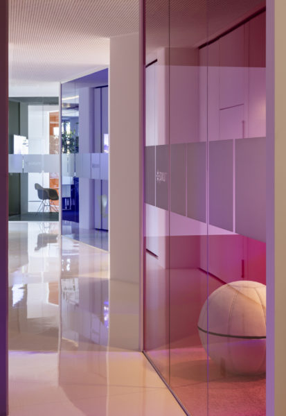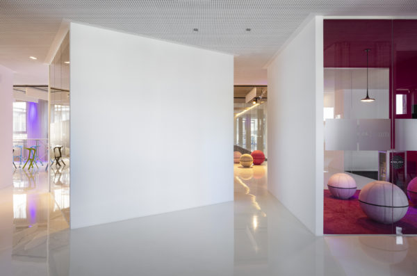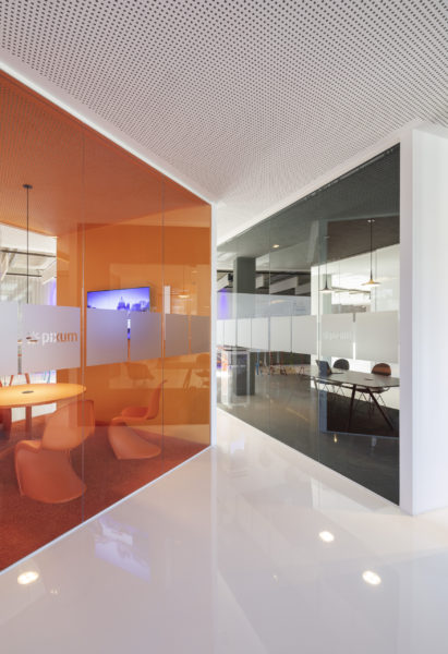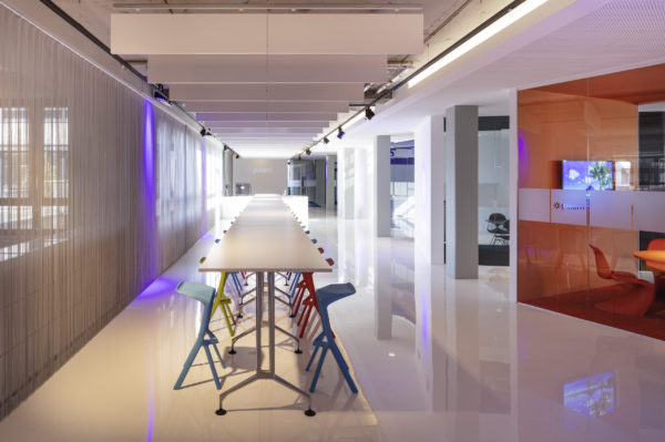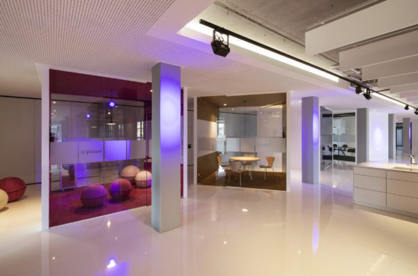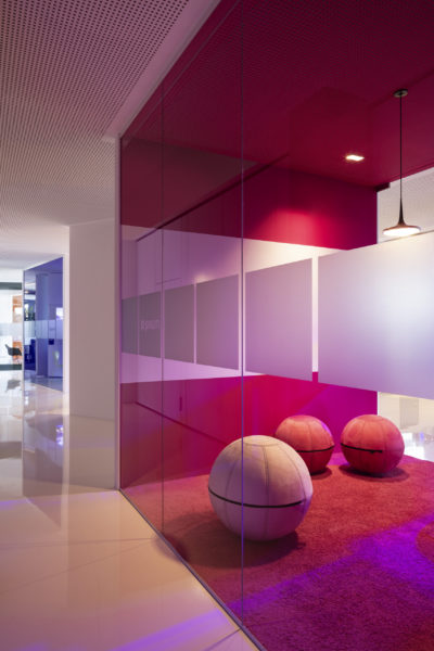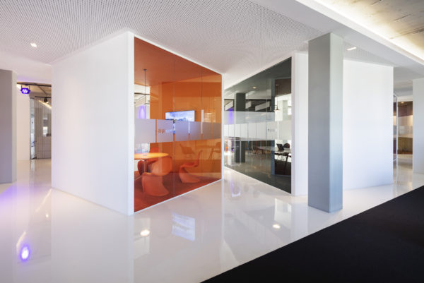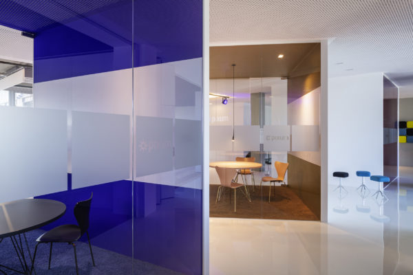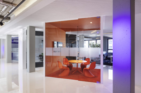 Ampliar otra planta para el mismo cliente ofrece la oportunidad de reflexionar sobre nuestro propio trabajo, replantearnos las áreas que no funcionan, analizarlas y, sencillamente, mejorarlas. El objetivo que pudimos formular junto con todos los implicados era continuar con lo ya probado y dar un nuevo impulso. Se pidió a los empleados que aportaran nuevas ideas, pero también que fueran críticos con las viejas estructuras. El resultado fue un catálogo de medidas que desempeñaron un papel clave en la determinación del nuevo diseño. El colorido mundo Pixum se refleja arquitectónicamente en las coloridas esculturas de las habitaciones. Las unidades funcionales individuales, que consisten en puestos de trabajo de oficina, zonas de comunicación, cafetería y salas de reuniones, reciben su respectiva localización mediante la zonificación del área de espacio abierto. El suelo de resina epoxi blanca brillante está conectado al techo suspendido sobre las zonas de comunicación a través de los paneles de pared de los cubos. Una junta de luz circunferencial lo diferencia del techo de hormigón visto en bruto y refuerza así el carácter de las esculturas de la sala colocadas en el armazón. Estos elementos ya se utilizaron en 2012 para el diseño de la primera zona.