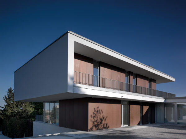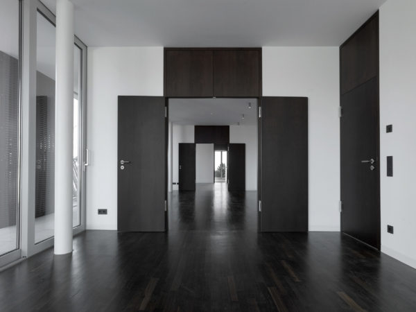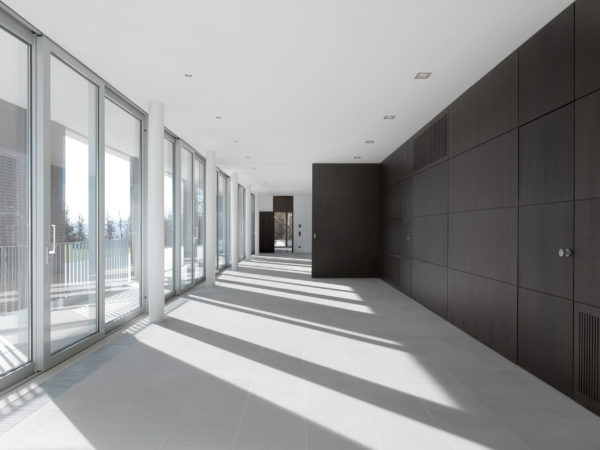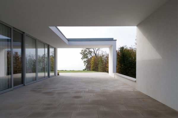 El manejo sin umbrales del suelo de piedra natural y las fachadas acristaladas de suelo a techo con sus generosos elementos correderos en las estancias privadas y representativas eliminan aparentemente los límites entre el espacio interior y el exterior. La elección de materiales es estrictamente reducida y se limita a una combinación de piedra natural (cuarcita de Steigerwald), yeso, acero y roble ahumado.