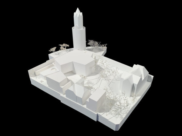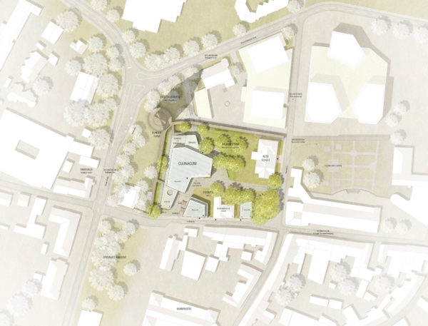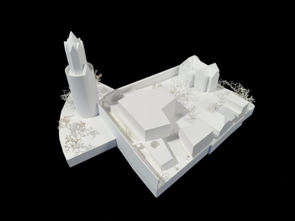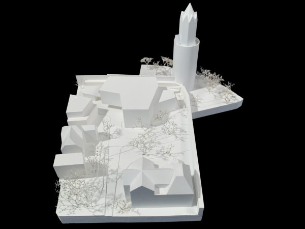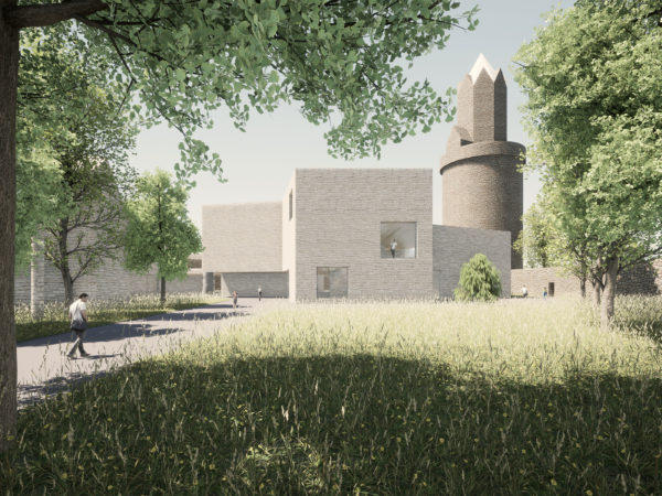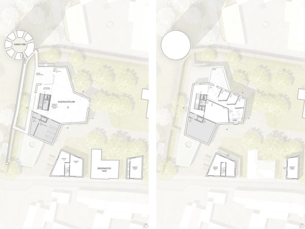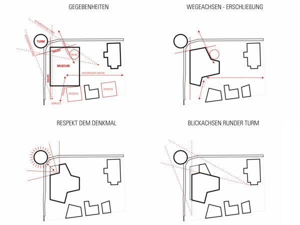 Das Konzept für den Museumsneubau erhält die historische Stadtmauer mit ihrem Rundturm und konzentriert die bauliche Entwicklung auf den inneren Bereich des Grundstücks. Der polygonale Baukörper schafft vielseitige Sicht- und Wegeverbindungen, insbesondere zwischen der Hochstraße im Süden, der historischen Wegeverbindung der Herrengasse und dem neuen Museumsgarten. Dabei ermöglichen Fassadenrücksprünge gezielte Blickachsen, wie etwa auf den Turm.