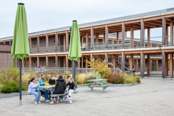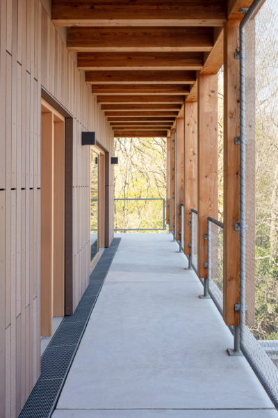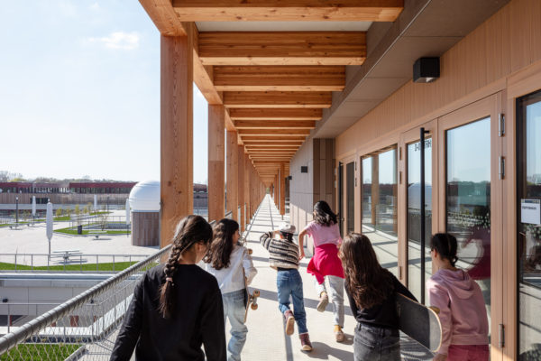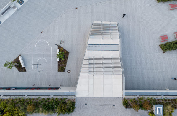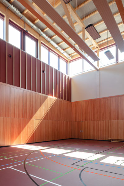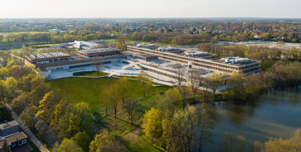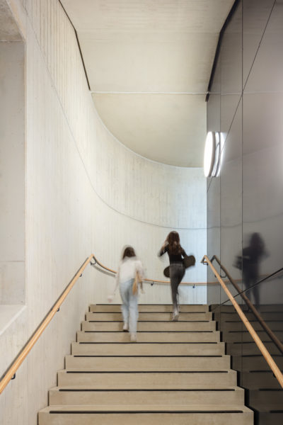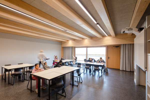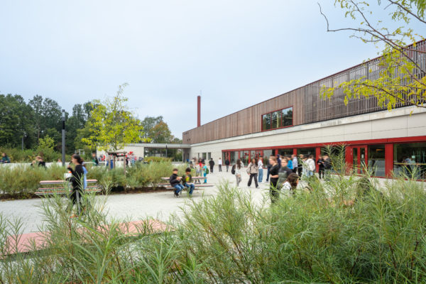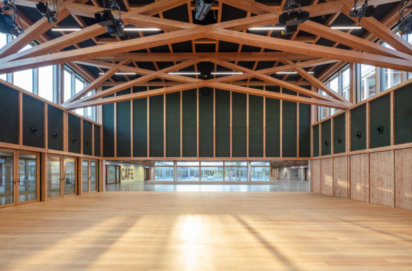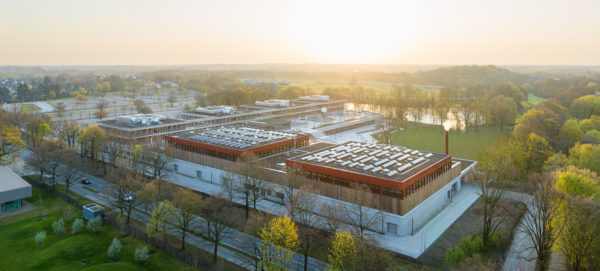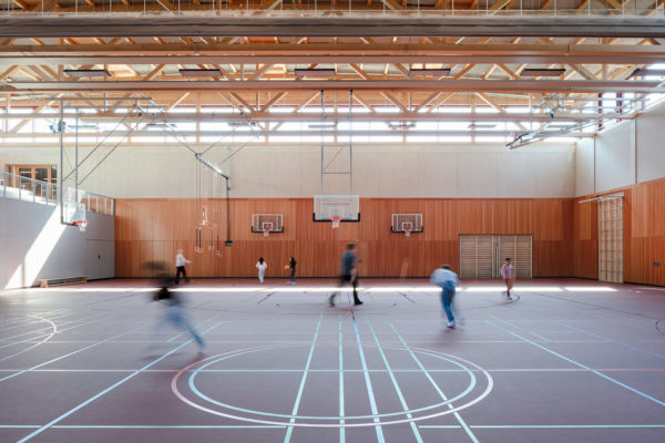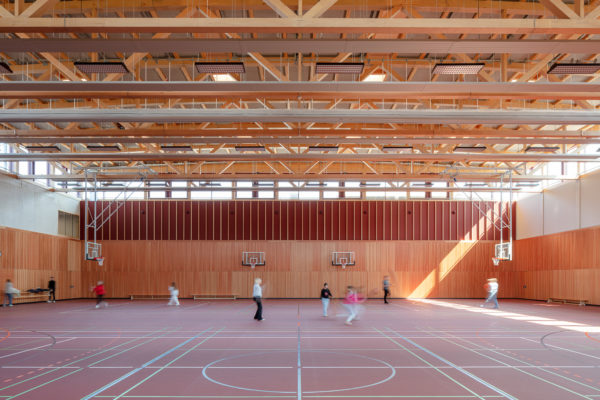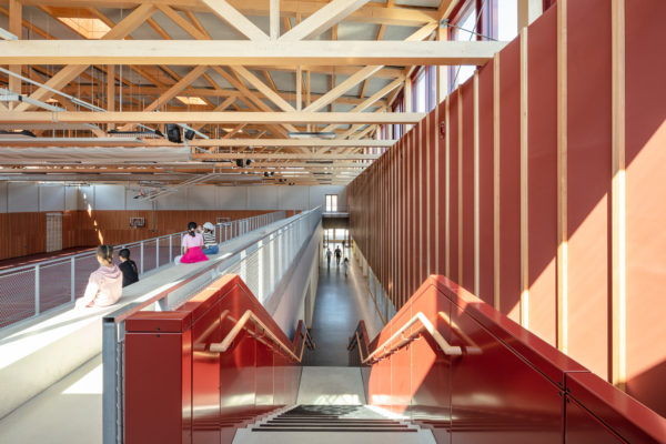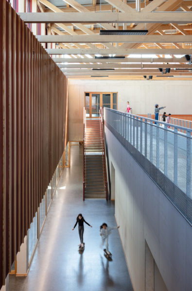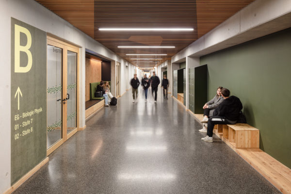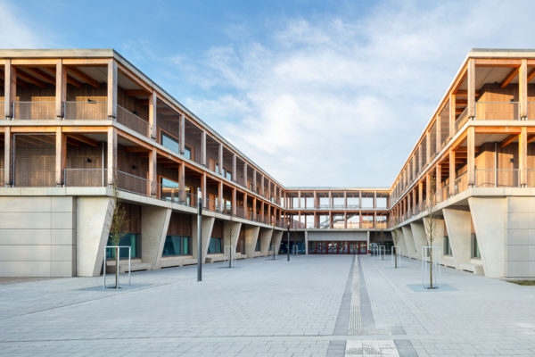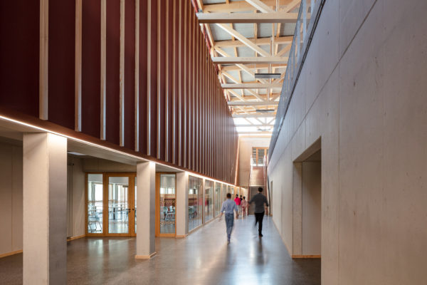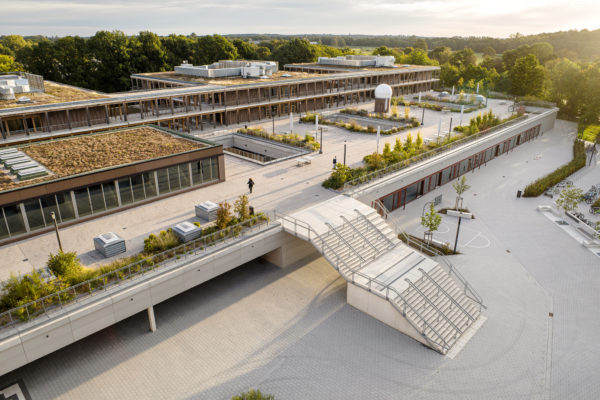 Der räumlichen Komplexität einer Schule für 1700 Schülerinnen und Schüler sowie 200 Lehrerinnen und Lehrer wird mit einer möglichst einfachen Grundstruktur für die neue Schule begegnet. Das einfache Auffinden aller Orte auf möglichst kurzen und einfachen Wegen und der Kontakt mit der Offenheit, Luftigkeit und Vielfalt des umgebenden Landschaftsraums soll das Schulleben im neuen Haus prägen. Das Dach des erdgeschossigen Volumens ist als erweiterter Teil des Schulhofes angelegt. Die in „Stufenhäusern“ als Cluster organisierten Jahrgänge haben so über Laubengänge direkten Zugang zu den Außenbereichen. Ein ringförmiger Schulboulevard bindet alle erdgeschossigen Funktionen zusammen und bildet gemeinsam mit dem Foyer und der Aula das „Herz der Schule“. Dieser Boulevard ist als „Wegraum“ angelegt, indem er vielfältige Nutzungen ermöglicht: Arbeitsnischen, Gruppentische, Präsentationsflächen auf Wänden und in Vitrinen, Treffpunkte und Rückzugsbereiche. In den ringförmigen Boulevard eingeschoben, liegt der Eingang über einen großen Eingangshof, um dem allmorgendlichen Ankommen der Schulgemeinschaft Raum und Atmosphäre zu geben. Sporthallen und Mensa sind in einem, diese großen Raumvolumina zelebrierenden Baukörper, zusammengefasst und schotten das Schulgelände von der lauten Straße im Westen ab. Wo immer es Bau- und Brandschutzvorschriften zulassen ist Holz als Primär- und Ausbaubaustoff gewählt.